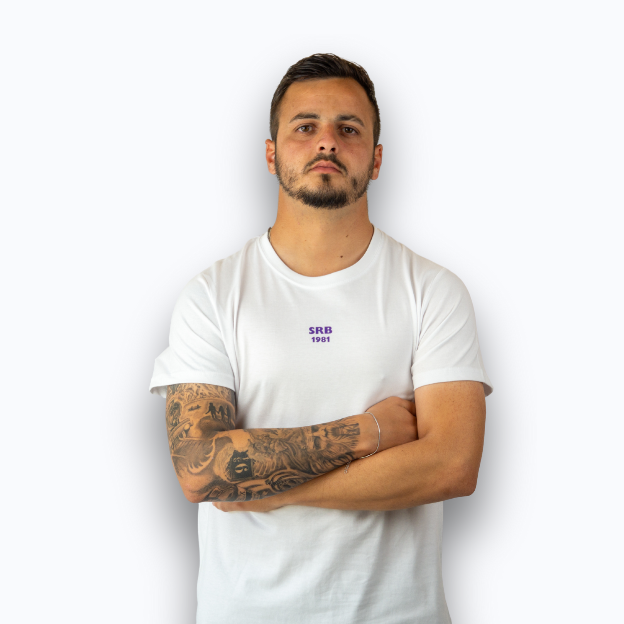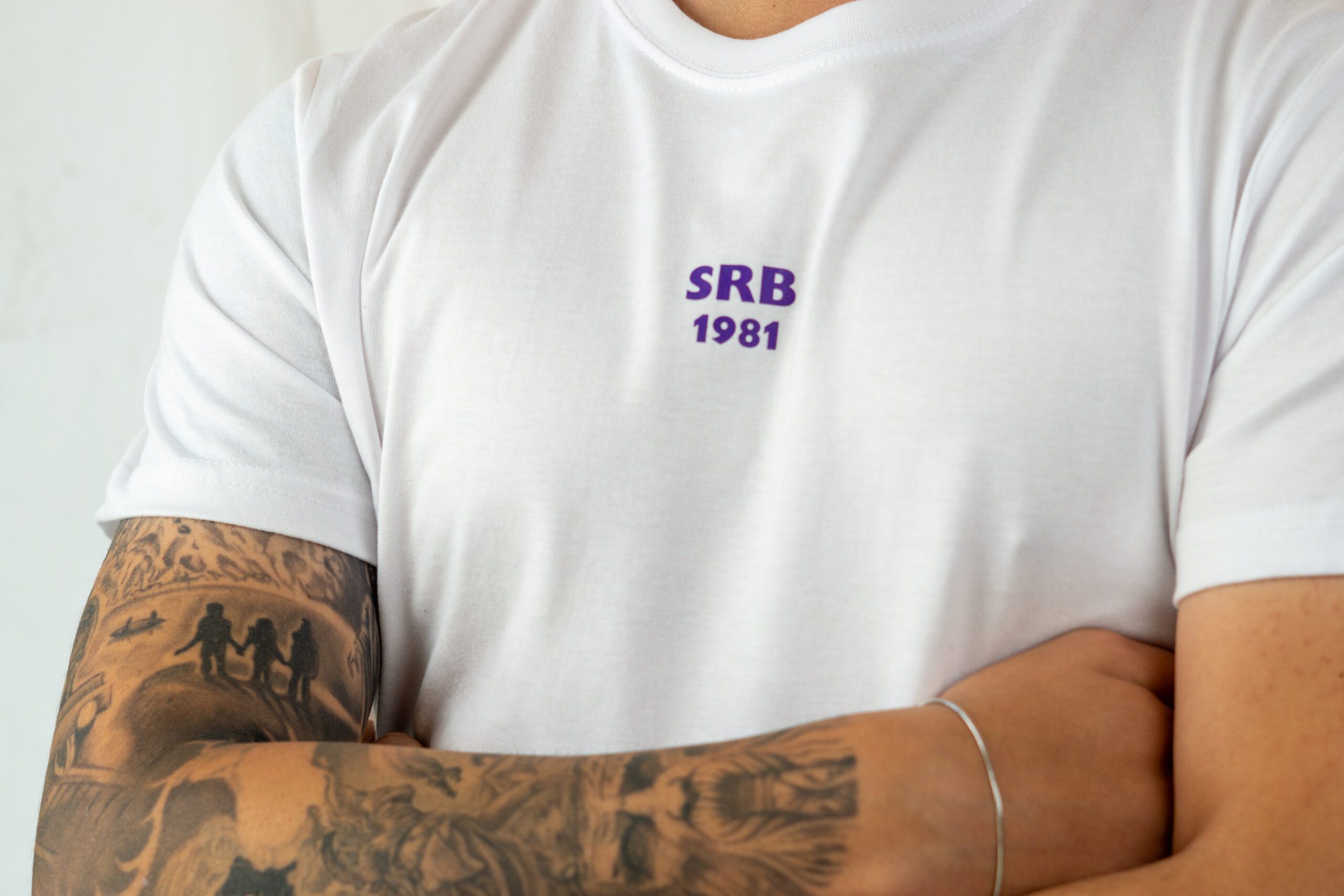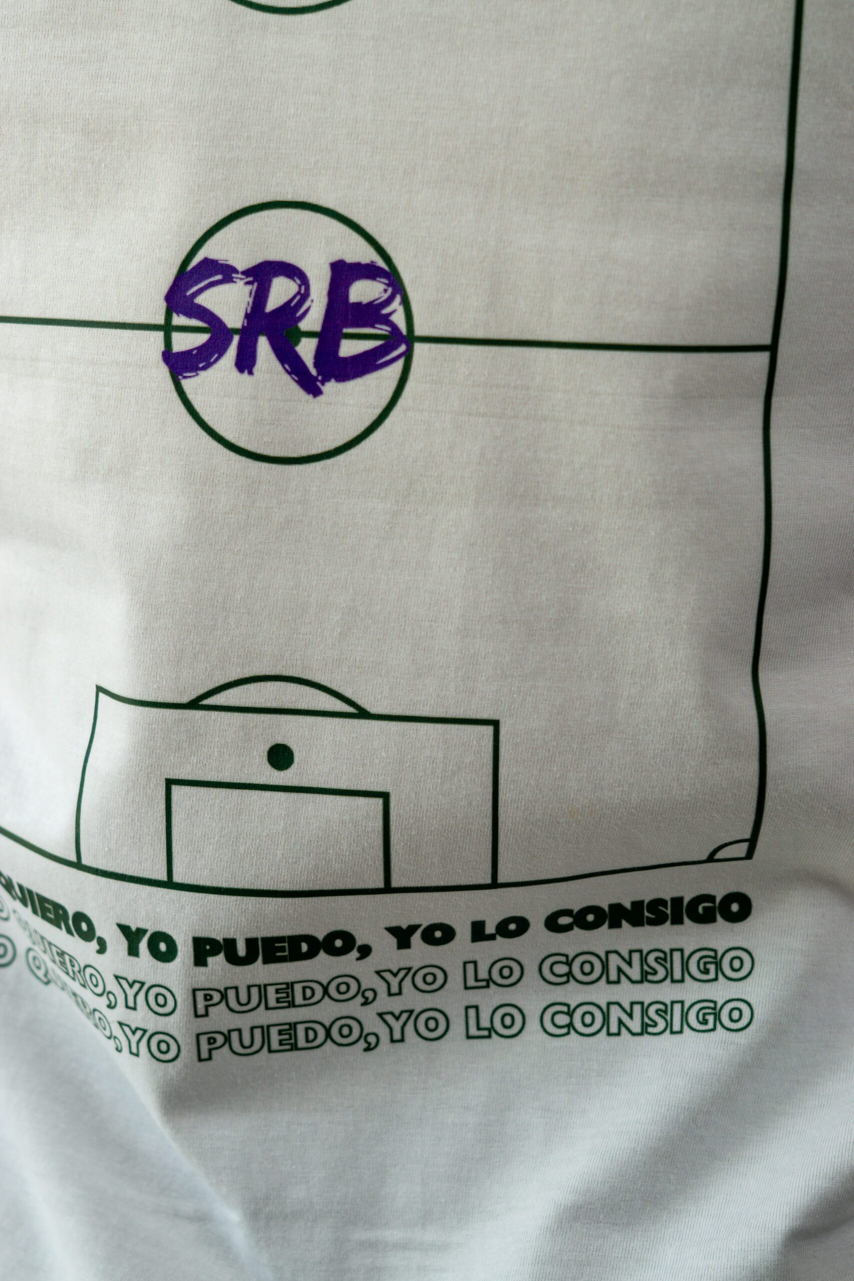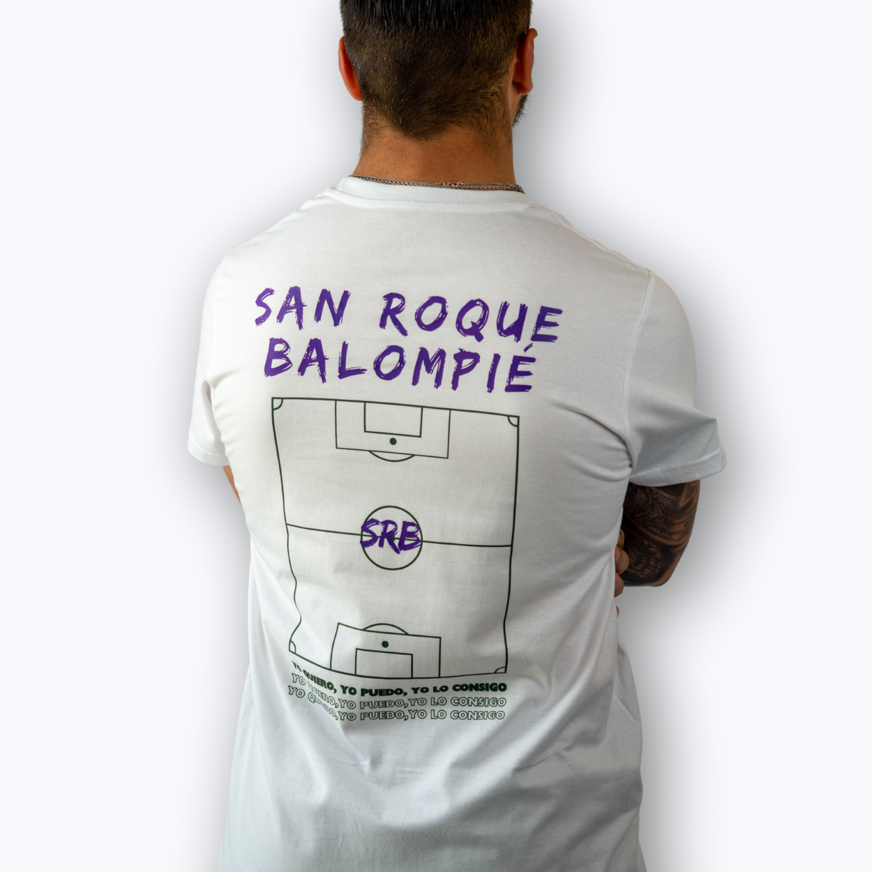 La Camiseta blanca SRB Campo de Fútbol es una edición especial que combina el estilo urbano con la esencia del San Roque Balompié. En el frontal luce un diseño minimalista con el texto SRB 1981 en morado, mientras que en la espalda incorpora un original dibujo de campo de fútbol, coronado con el logo del club y el mensaje motivacional que define nuestra filosofía: