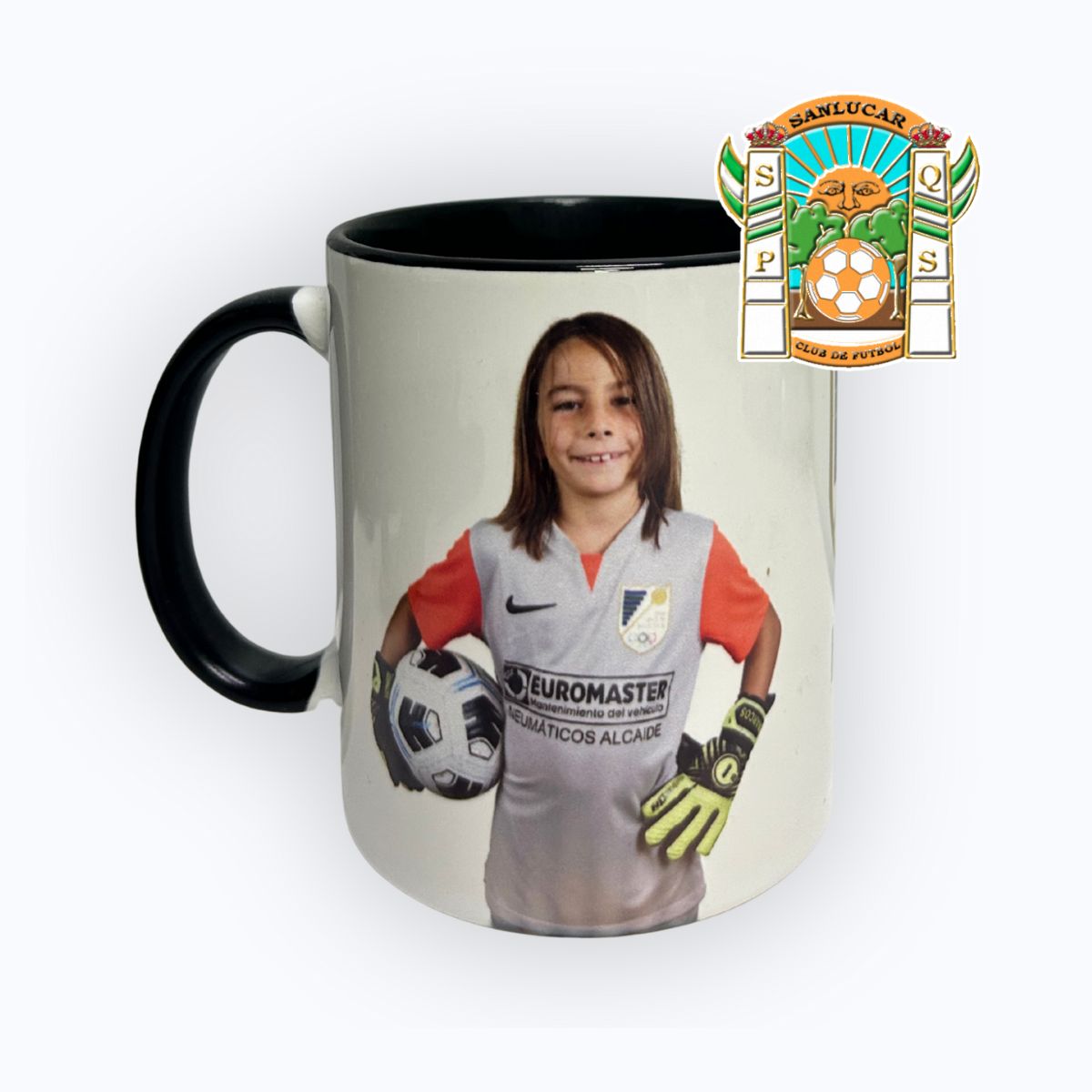 Taza personalizada oficial del Atco Sanlucar, diseñada con la imagen del jugador y el escudo del club. Un producto único que combina utilidad y sentimiento de pertenencia, ideal para regalar o coleccionar.