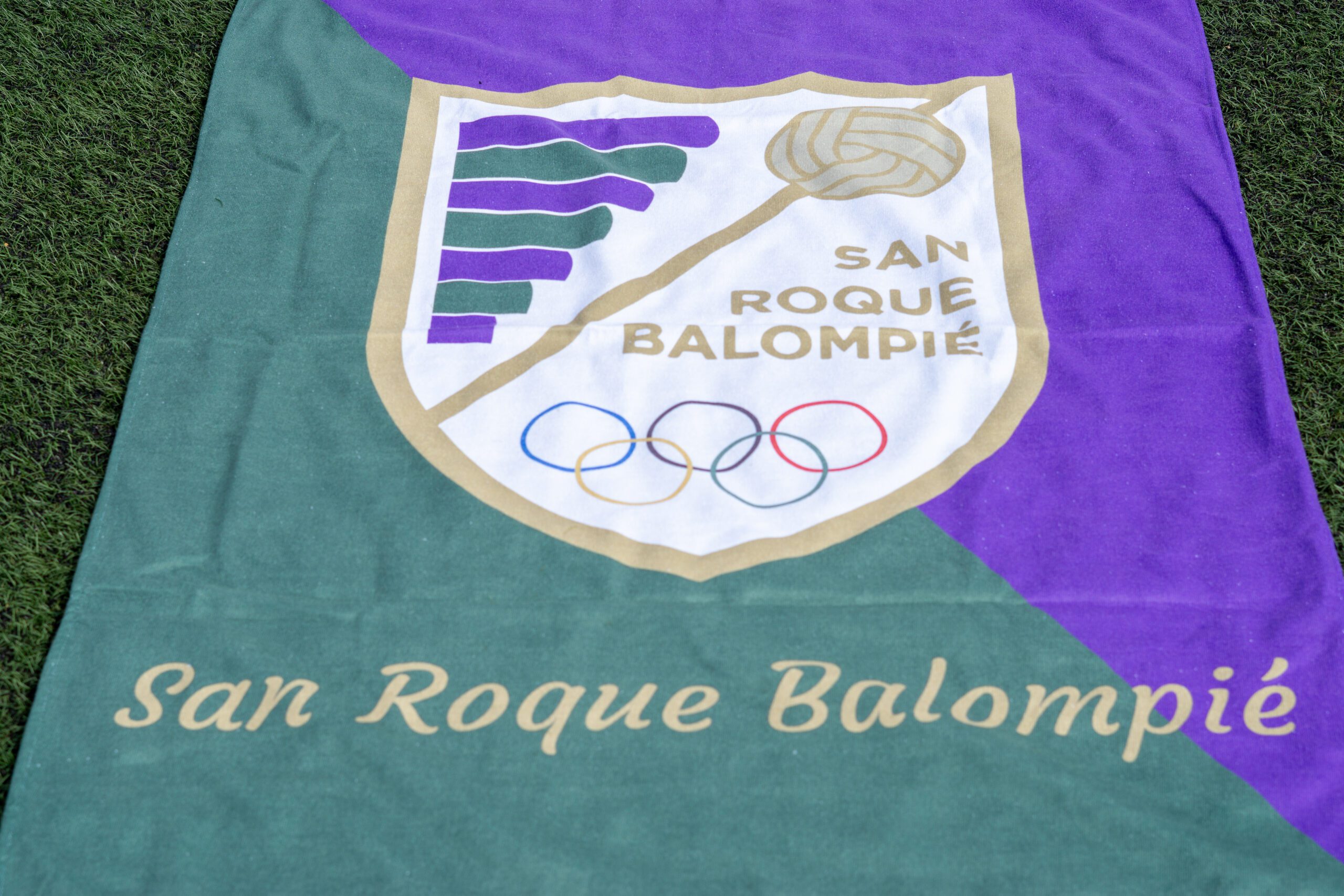 Luce con orgullo los colores del San Roque Balompié también en la playa, la piscina o el vestuario. La toalla oficial combina funcionalidad, ligereza y diseño exclusivo, con el escudo del club a todo color sobre los tonos morado y verde que representan nuestra identidad.